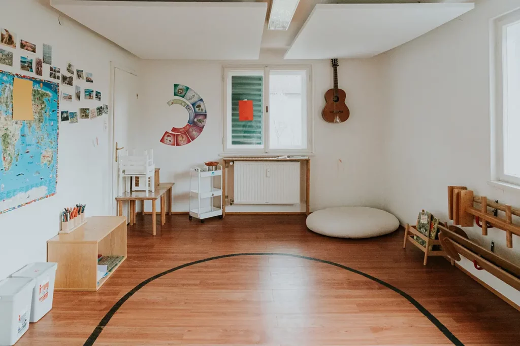 Im Spielzimmer tauchen die Kinder in die Welt der „Kosmischen Erziehung“ ein. Sie experimentieren mit Montessori-Sinnesmaterialien, setzen sich mit Sprache auseinander und wagen erste Schreibversuche. In der Spürnasenecke können sie unter Anleitung altersgerecht forschen und experimentieren – ein spielerischer Einstieg in den MINT-Bereich.
